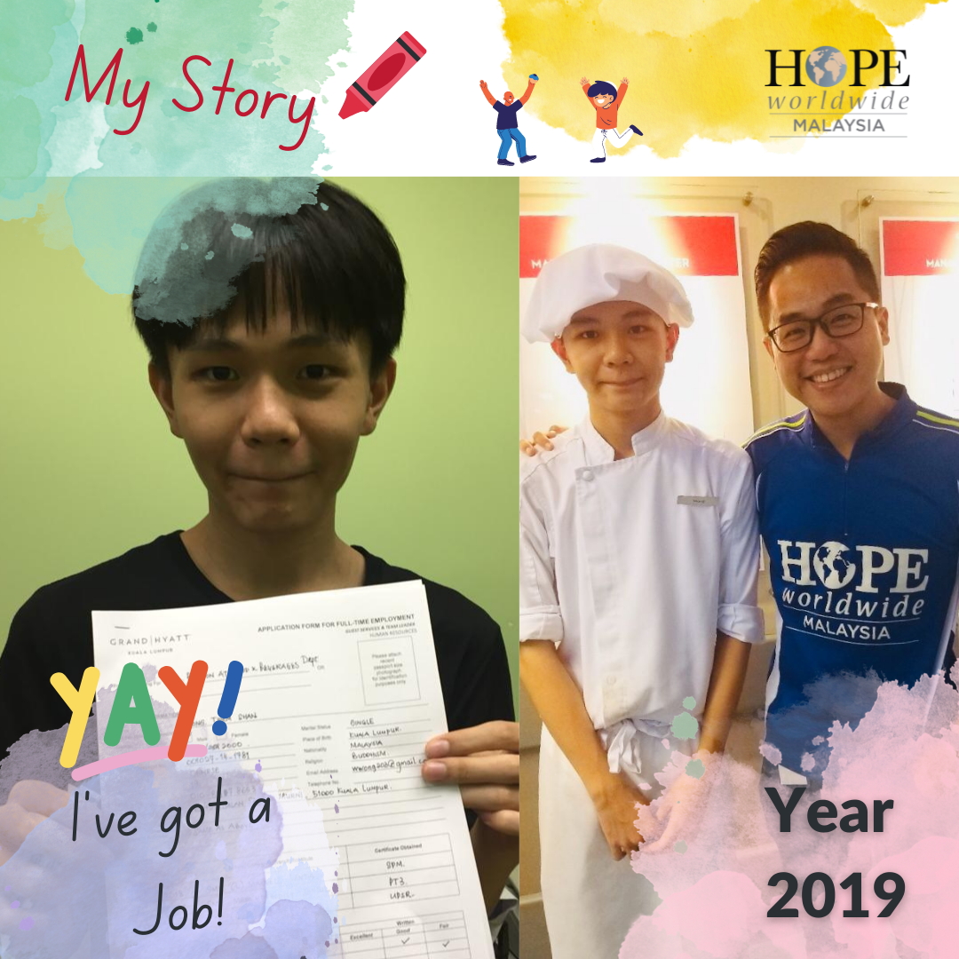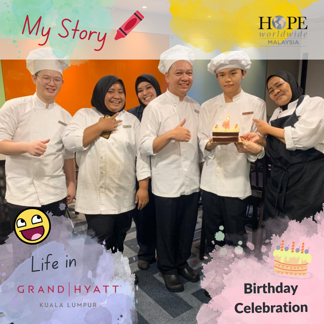 After we helped Thiem Shan complete his secondary education, his future remained uncertain. That was when Grand Hyatt Kuala Lumpur contacted us for a CSR collaboration, to provide training and job opportunities for our youths from low-income families. Thiem Shan was keen to grab the job but he wasn’t fluent in either English or Malay, and he was afraid that Grand Hyatt would not give him the job. We were thankful to Grand Hyatt, as they see beyond the shortcoming, and were willing to give the opportunity to Thiem Shan. He was eventually hired as an apprentice in the Food & Beverages Department.